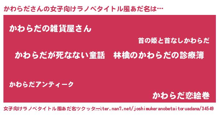 | 男性向けラノベタイトル風あだ名 | 『魔弾の王とかわらだ』 |