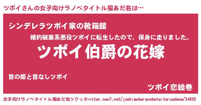 | 男性向けラノベタイトル風あだ名 | 『うちの娘の為ならば、俺はもしかしたらツボイも倒せるかもしれない。』 |
