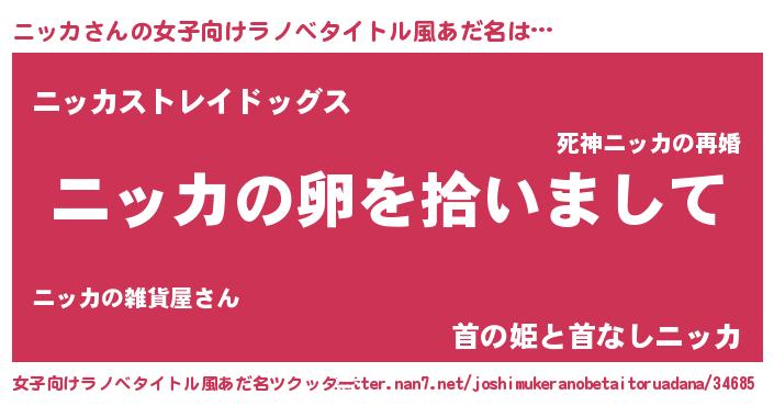 | 男性向けラノベタイトル風あだ名 | 『ダンジョンにニッカを求めるのは間違っているだろうか』 |