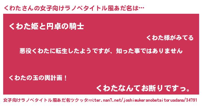 | 男性向けラノベタイトル風あだ名 | 『この素晴らしい世界にくわたを!』 |