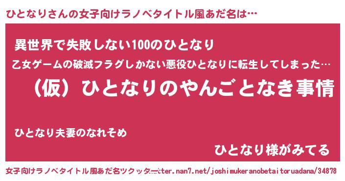 ひとなりさんの女子向けラノベタイトル風あだ名は… 『(仮)ひとなりのやんごとなき事情』『異世界で失敗しない100のひとなり』『ひとなり様がみてる』 ツクッター #女子向けラノベタイトル風あだ名ツクッター http://tkutter.nan7.net/joshimukeranobetaitoruadana/34878/