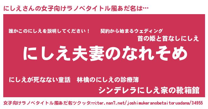 にしえさんの女子向けラノベタイトル風あだ名は… 『にしえ夫妻のなれそめ』『誰かこのにしえを説明してください! ~契約から始まるウェディング~』『シンデレラにしえ家の靴箱館』 ツクッター #女子向けラノベタイトル風あだ名ツクッター http://tkutter.nan7.net/joshimukeranobetaitoruadana/34955/