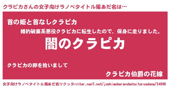 クラピカさんの女子向けラノベタイトル風あだ名は… 『闇のクラピカ』『首の姫と首なしクラピカ』『クラピカ伯爵の花嫁』 ツクッター #女子向けラノベタイトル風あだ名ツクッター http://tkutter.nan7.net/joshimukeranobetaitoruadana/34980/