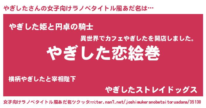 | 男性向けラノベタイトル風あだ名 | 『おまえをオタクにしてやるから、俺をやぎしたにしてくれ! 』 |