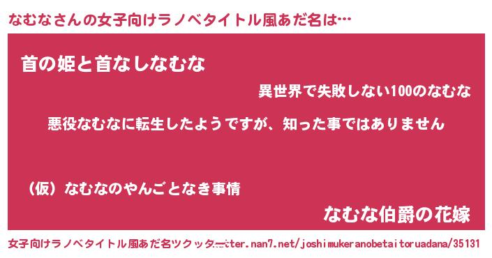 | 男性向けラノベタイトル風あだ名 | 『この素晴らしい世界になむなを!』 |