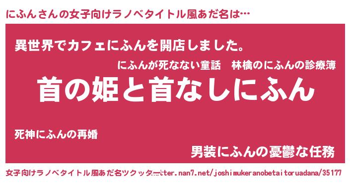 にふんさんの女子向けラノベタイトル風あだ名は… 『首の姫と首なしにふん』『異世界でカフェにふんを開店しました。』『男装にふんの憂鬱な任務』 ツクッター #女子向けラノベタイトル風あだ名ツクッター http://tkutter.nan7.net/joshimukeranobetaitoruadana/35177/