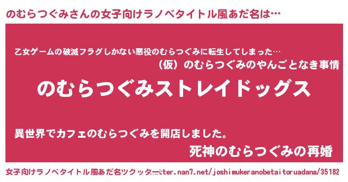 のむらつぐみさんの女子向けラノベタイトル風あだ名は… 『のむらつぐみストレイドッグス』『乙女ゲームの破滅フラグしかない悪役のむらつぐみに転生してしまった…』『死神のむらつぐみの再婚』 ツクッター #女子向けラノベタイトル風あだ名ツクッター http://tkutter.nan7.net/joshimukeranobetaitoruadana/35182/