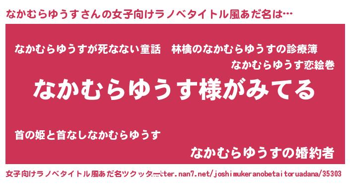 なかむらゆうすさんの女子向けラノベタイトル風あだ名は… 『なかむらゆうす様がみてる』『なかむらゆうすが死なない童話 林檎のなかむらゆうすの診療簿』『なかむらゆうすの婚約者』 ツクッター #女子向けラノベタイトル風あだ名ツクッター http://tkutter.nan7.net/joshimukeranobetaitoruadana/35303/