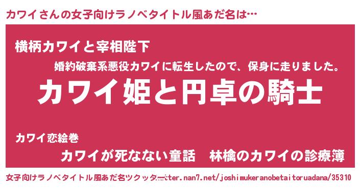| 男性向けラノベタイトル風あだ名 | 『カワイの憂鬱』『魔弾の王とカワイ』 |