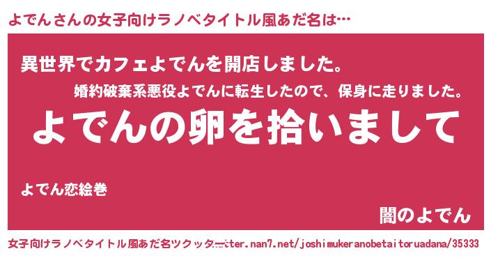 | 男性向けラノベタイトル風あだ名 | 『よでんの嫁は女の子じゃないと思った?』 |