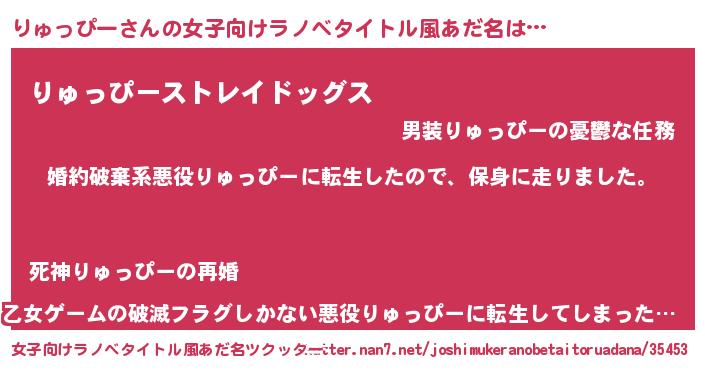 りゅっぴーさんの女子向けラノベタイトル風あだ名は… 『婚約破棄系悪役りゅっぴーに転生したので、保身に走りました。』『りゅっぴーストレイドッグス』『乙女ゲームの破滅フラグしかない悪役りゅっぴーに転生してしまった…』 ツクッター #女子向けラノベタイトル風あだ名ツクッター http://tkutter.nan7.net/joshimukeranobetaitoruadana/35453/