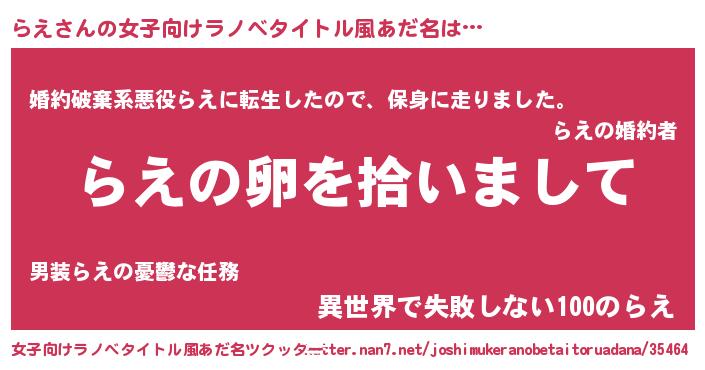 | 男性向けラノベタイトル風あだ名 | 『らえの嫁は女の子じゃないと思った?』 |