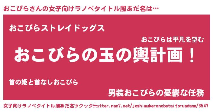 | 男性向けラノベタイトル風あだ名 | 『転生したらおこびらだった件』 |