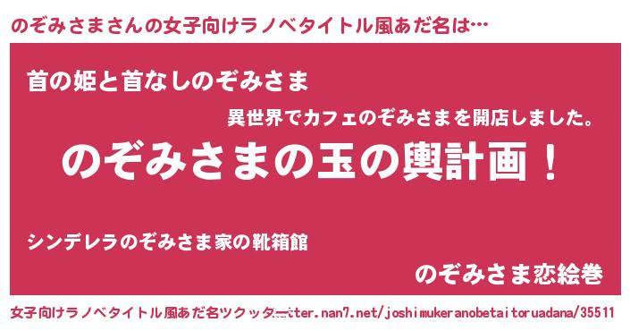 | 男性向けラノベタイトル風あだ名 | 『のぞみさま~年齢イコール彼女いない歴の魔法使い~』 |