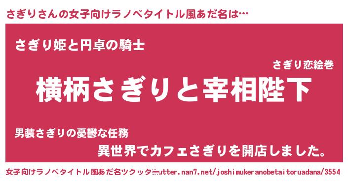 さぎりさんの女子向けラノベタイトル風あだ名は… 『横柄さぎりと宰相陛下』『さぎり姫と円卓の騎士』『異世界でカフェさぎりを開店しました。』 ツクッター #女子向けラノベタイトル風あだ名ツクッター http://tkutter.nan7.net/joshimukeranobetaitoruadana/3554/