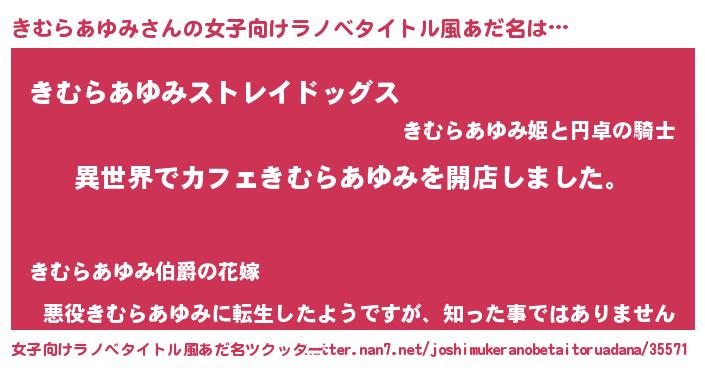 | 男性向けラノベタイトル風あだ名 | 『誰もが恐れるあのきむらあゆみが、ぼくの専属メイドになるようです。』 |