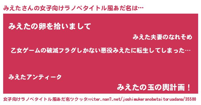 | 男性向けラノベタイトル風あだ名 | 『この素晴らしい世界にみえたを!』 |