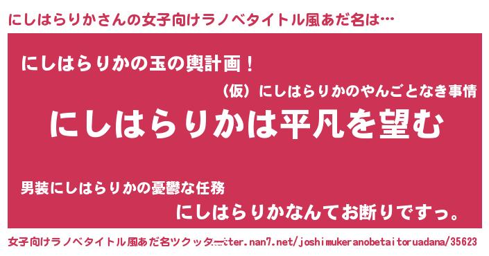 | 男性向けラノベタイトル風あだ名 | 『ダンジョンににしはらりかを求めるのは間違っているだろうか』 |