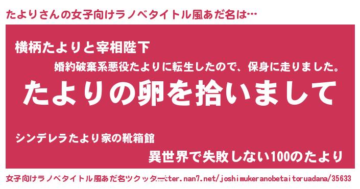 | 男性向けラノベタイトル風あだ名 | 『たよりの嫁は女の子じゃないと思った?』 |