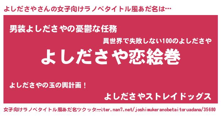 | 男性向けラノベタイトル風あだ名 | 『おまえをオタクにしてやるから、俺をよしださやにしてくれ! 』 |