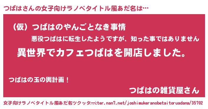 | 男性向けラノベタイトル風あだ名 | 『誰もが恐れるあのつばはが、ぼくの専属メイドになるようです。』 |