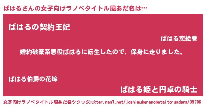 | 男性向けラノベタイトル風あだ名 | 『バハルスレイヤー』『ばはるの憂鬱』 |
