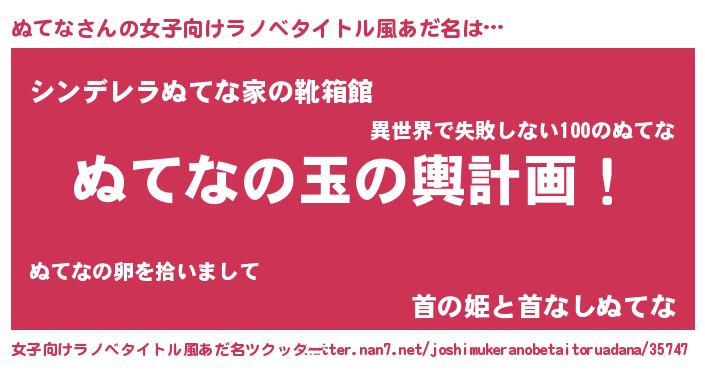 | 男性向けラノベタイトル風あだ名 | 『ぬてな~年齢イコール彼女いない歴の魔法使い~』 |