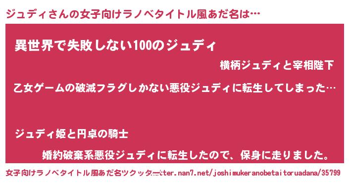 | 男性向けラノベタイトル風あだ名 | 『この素晴らしい世界にジュディを!』 |