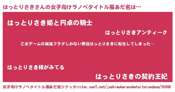 | 男性向けラノベタイトル風あだ名 | 『この素晴らしい世界にはっとりさきを!』 |