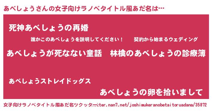 | 男性向けラノベタイトル風あだ名 | 『魔弾の王とあべしょう』 |