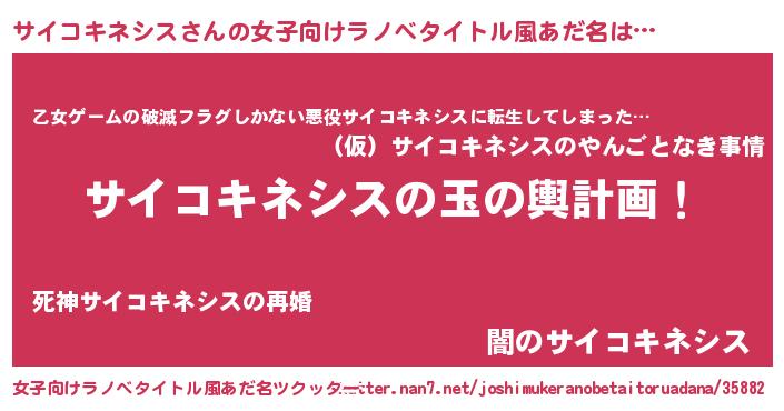 | 男性向けラノベタイトル風あだ名 | 『サイコキネシス~年齢イコール彼女いない歴の魔法使い~』 |