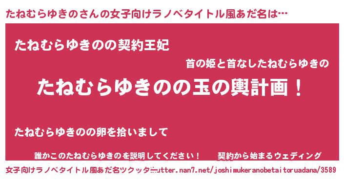 | 男性向けラノベタイトル風あだ名 | 『たねむらゆきの~年齢イコール彼女いない歴の魔法使い~』 |