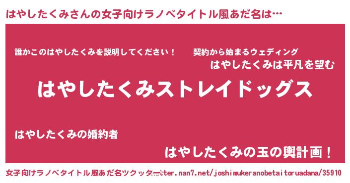 | 男性向けラノベタイトル風あだ名 | 『Re:はやしたくみから始める異世界生活』 |
