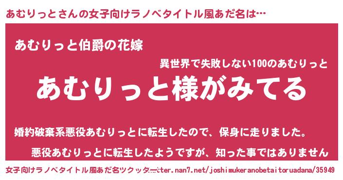 | 男性向けラノベタイトル風あだ名 | 『あむりっとの嫁は女の子じゃないと思った?』 |