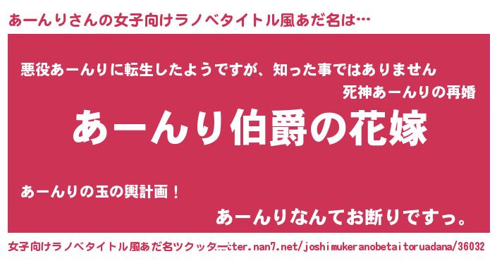 | 男性向けラノベタイトル風あだ名 | 『うちの娘の為ならば、俺はもしかしたらあーんりも倒せるかもしれない。』 |