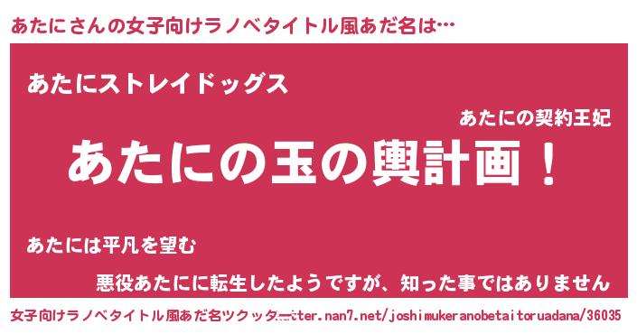 | 男性向けラノベタイトル風あだ名 | 『あたに~年齢イコール彼女いない歴の魔法使い~』 |