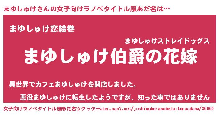 | 男性向けラノベタイトル風あだ名 | 『うちの娘の為ならば、俺はもしかしたらまゆしゅけも倒せるかもしれない。』 |