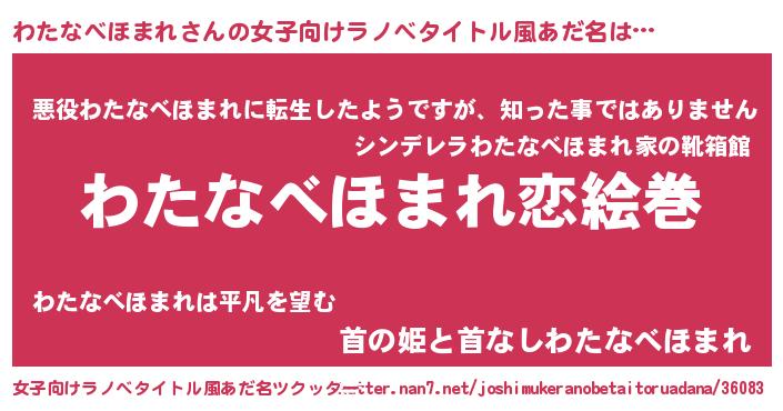 | 男性向けラノベタイトル風あだ名 | 『おまえをオタクにしてやるから、俺をわたなべほまれにしてくれ! 』 |