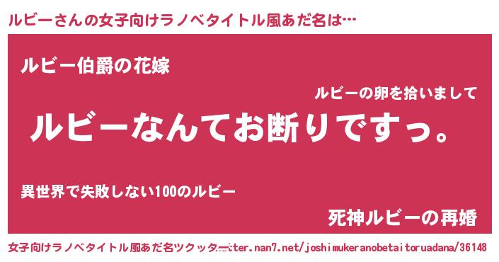 ルビーさんの女子向けラノベタイトル風あだ名は… 『ルビーなんてお断りですっ。』『ルビー伯爵の花嫁』『死神ルビーの再婚』 ツクッター #女子向けラノベタイトル風あだ名ツクッター http://tkutter.nan7.net/joshimukeranobetaitoruadana/36148/