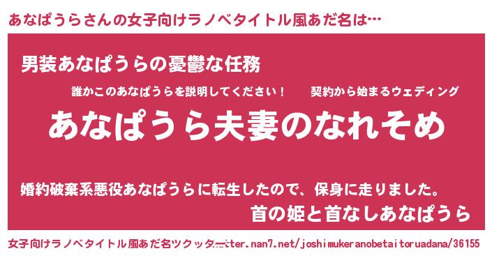 | 男性向けラノベタイトル風あだ名 | 『おまえをオタクにしてやるから、俺をあなぱうらにしてくれ! 』 |