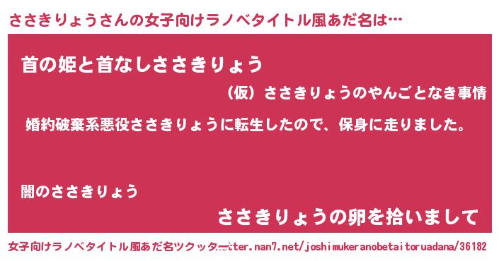 | 男性向けラノベタイトル風あだ名 | 『転生したらささきりょうだった件』 |