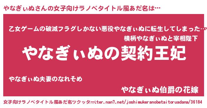 | 胡散臭い通販商品みたいなあだ名 | 『来世でも幸せになれる水素水…その名も「やなぎぃぬ」』 |