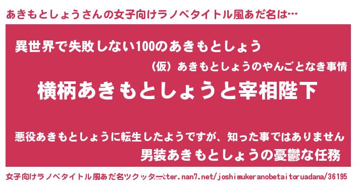 | 男性向けラノベタイトル風あだ名 | 『あきもとしょうに滅ぼされるだけの簡単なお仕事です』 |