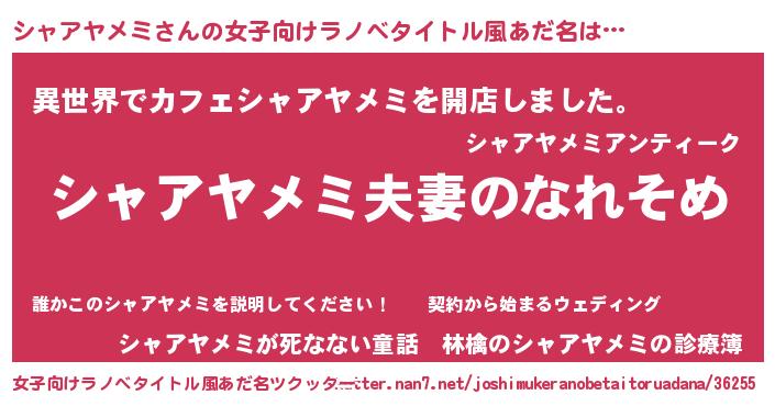 | 男性向けラノベタイトル風あだ名 | 『おまえをオタクにしてやるから、俺をシャアヤメミにしてくれ! 』 |