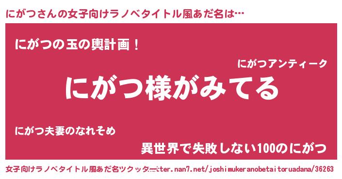 男性向けラノベタイトル風あだ名 | 『にがつの嫁は女の子じゃないと思った?』 |