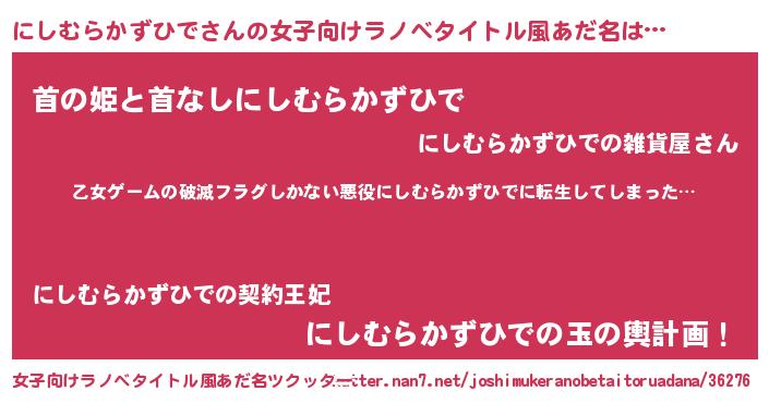 | 男性向けラノベタイトル風あだ名 | 『この素晴らしい世界ににしむらかずひでを!』 |