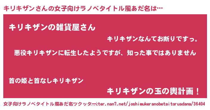 | 男性向けラノベタイトル風あだ名 | 『この素晴らしい世界にキリキザンを!』 |