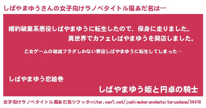 | 男性向けラノベタイトル風あだ名 | 『この素晴らしい世界にしばやまゆうを!』 |