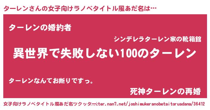| 男性向けラノベタイトル風あだ名 | 『ターレンという概念が存在しない退屈な世界 』 |