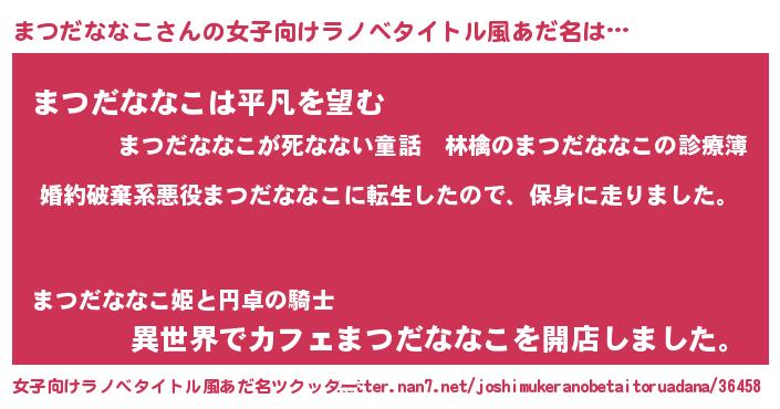 まつだななこさんの女子向けラノベタイトル風あだ名は… 『婚約破棄系悪役まつだななこに転生したので、保身に走りました。』『まつだななこは平凡を望む』『異世界でカフェまつだななこを開店しました。』 ツクッター #女子向けラノベタイトル風あだ名ツクッター http://tkutter.nan7.net/joshimukeranobetaitoruadana/36458/